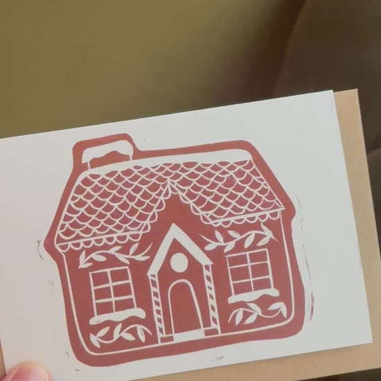 Send festive cheer with this charming Gingerbread House Christmas card, hand-printed from an original lino print design. Inspired by the warmth and nostalgia of traditional holiday baking, this unique handcrafted greetings card captures the cosy spirit of Christmas with intricate linocut detail and natural texture.