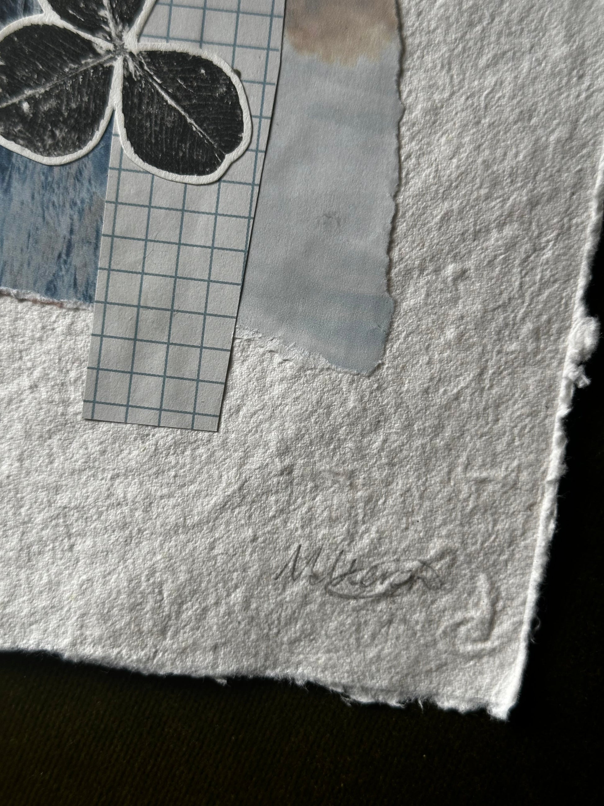Each piece captures the quiet balance between chance and intention - where torn edges meet smooth brushstrokes and soft blues meet glimmers of gold. The natural fibres of the Japanese paper add depth and warmth, giving the work a tactile, organic quality.