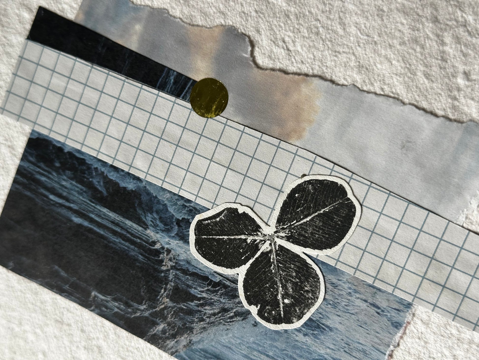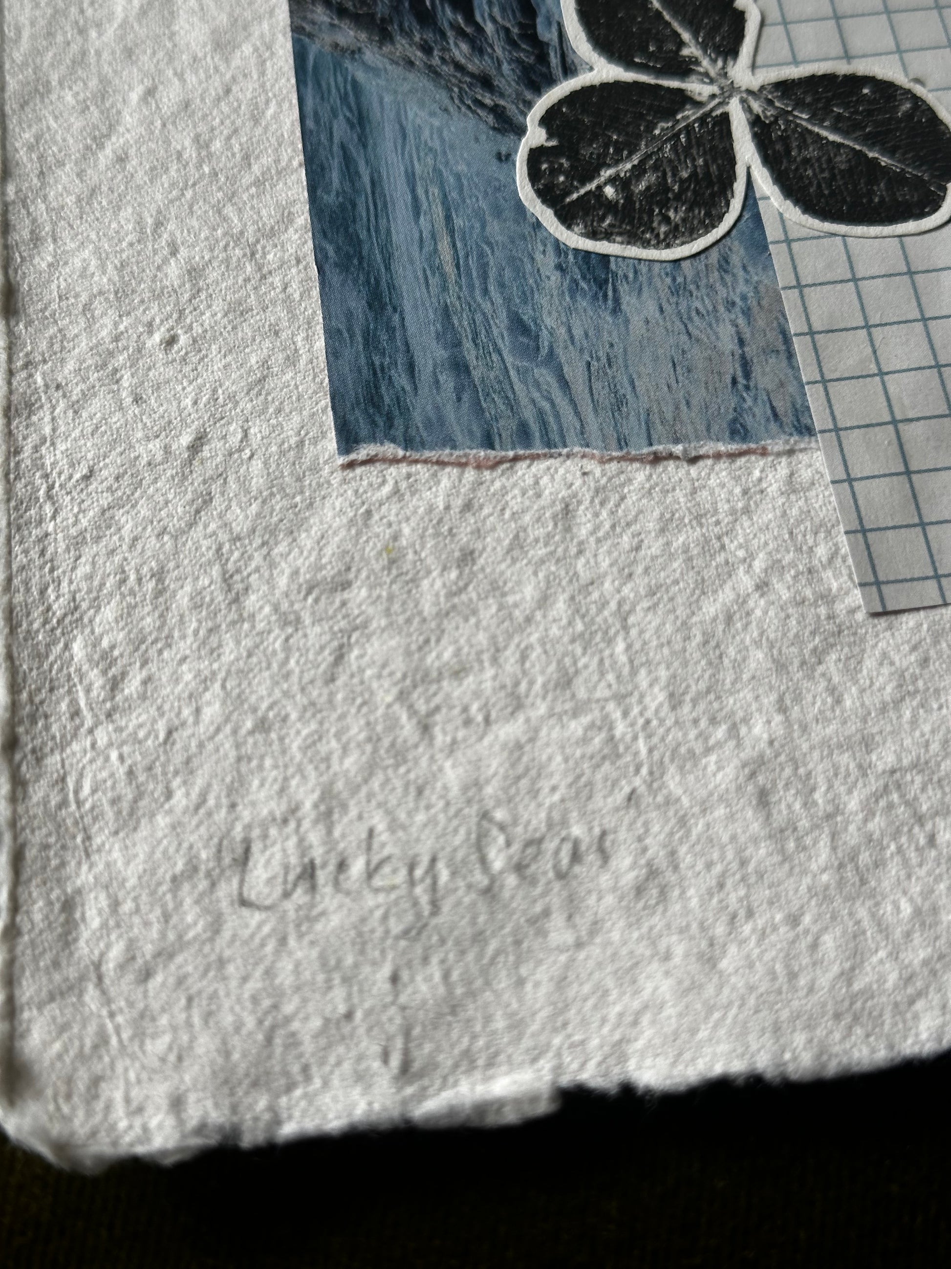 Lucky Seas is a one-of-a-kind A5 mixed media collage crafted on delicate handmade Japanese paper. Layered with textured fragments, painted details, and subtle metallic accents, it evokes the rhythm and calm of drifting tides.