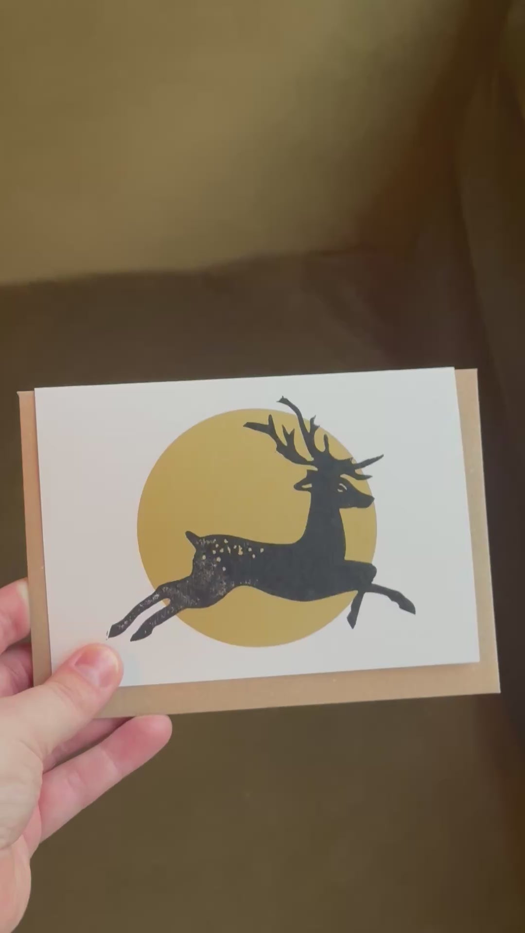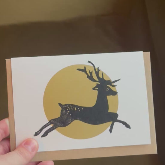 Bring a touch of festive magic to your Christmas greetings with this Flying Reindeer lino print card, featuring hand-carved detail and shimmering gold metallic accents. This whimsical design captures the joyful spirit of the season, perfect for sending cheer to friends and family.